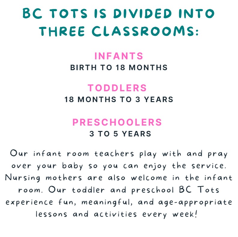 BC Tots serves children from birth through Pre-K in a safe, clean, and nurturing environment. Each Sunday and Wednesday, your child will experience the love of Jesus while enjoying fun, age-appropriate activities led by qualified teachers and classroom assistants.